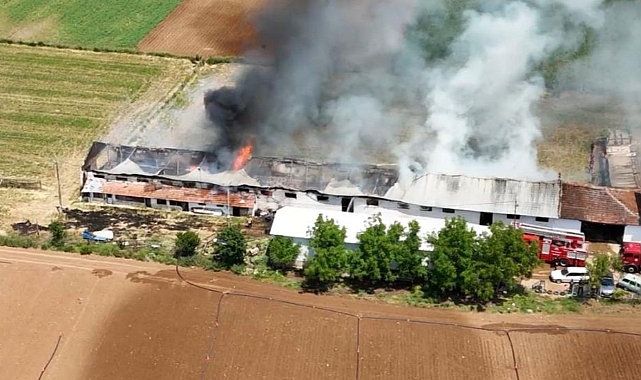 Hayvan çiftliğindeki büyük yangın havadan görüntülendi